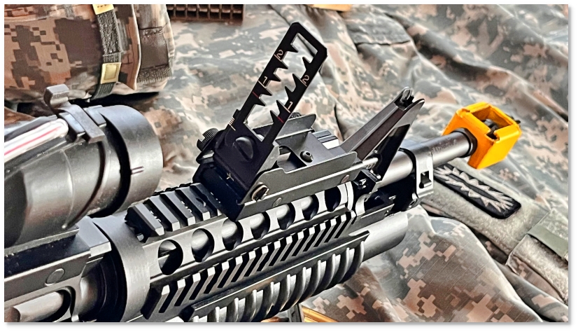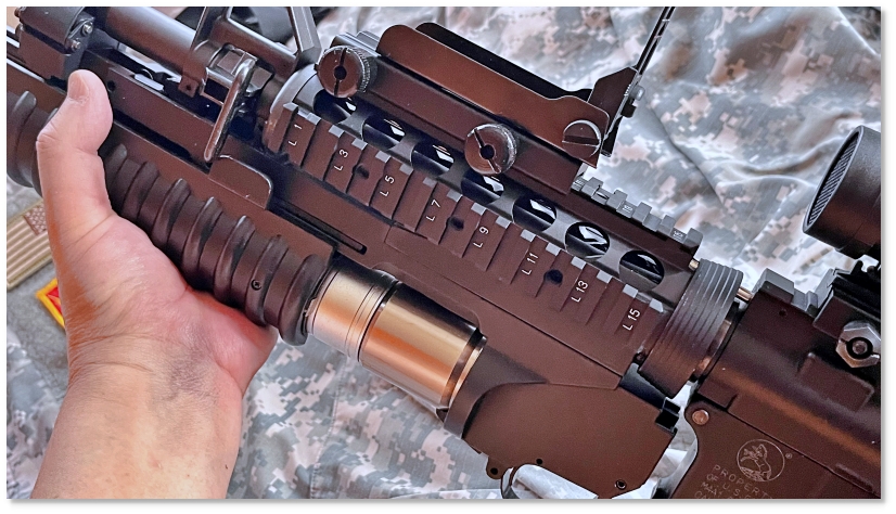 以前ハンドガードのアンダーレールに装着した写真は撮ったのだが、米軍の運用写真を見るとこういう装着法をしている例が皆無なのでやはりリアルな方をやってみたくなった。